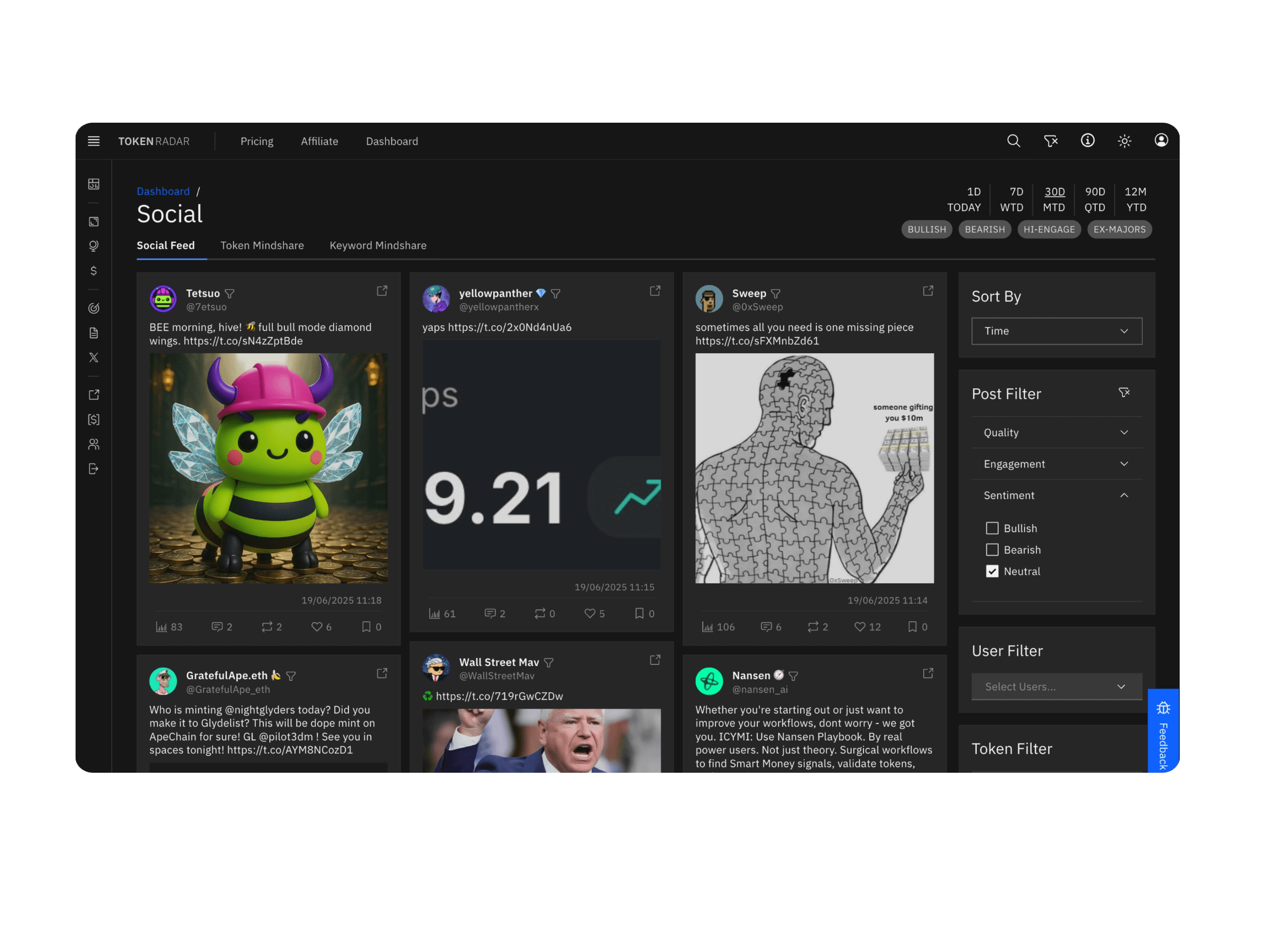 Track crypto influencers and filter posts by quality, sentiment, and engagement to surface the voices that move markets. Catch the conversation before it becomes consensus.